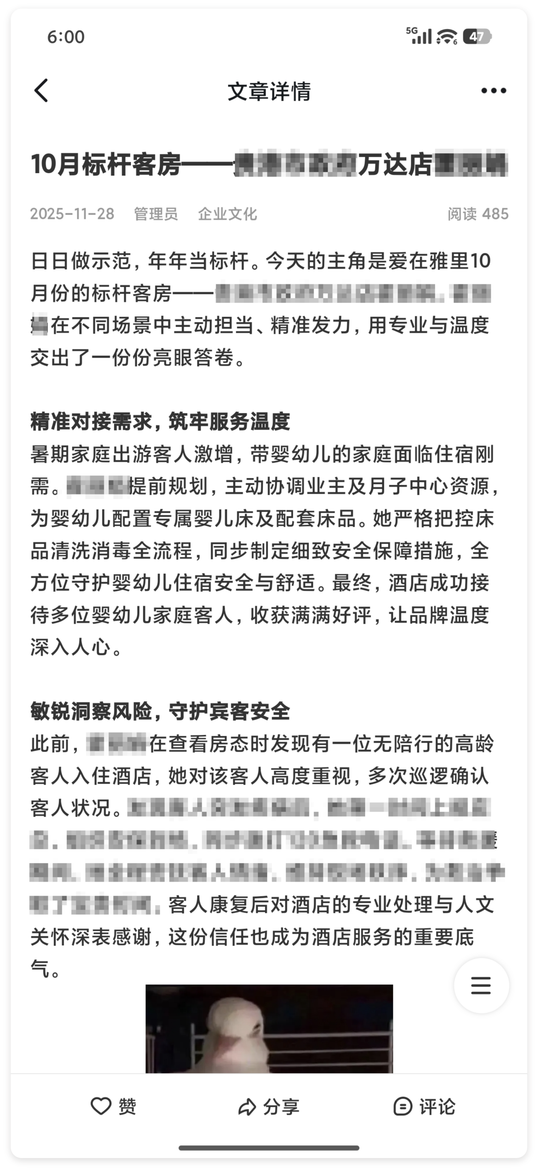 暑期家庭出游客人激增,带婴幼儿的家庭面临住宿刚需。Eva提前规划,主动协调业主及月子中心资源,为婴幼儿配置专属婴儿床及配套床品。她严格把控床品清洗消毒全流程,同步制定细致安全保障措施,全方位守护婴幼儿住宿安全与舒适。最终,酒店成功接待多位婴幼儿家庭客人,收获满满好评,让品牌温度深入人心。